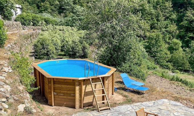 Let your gaze wander over the picturesque landscape from the balcony. Take advantage of the above-ground wooden pool for a refreshing dip on warm days. In the evening, enjoy a glass of wine or watch the stars in this peaceful setting.