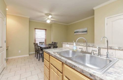 Boasting 2 furnished balconies and a ground-floor patio, this 3-story townhome offers ample space to unwind outdoors as well. Overlooking the pool, you can keep an eye on the kiddos while enjoying the shade and a cool beverage, steps away from the air-conditioned interior. When you’re ready to head inside, the breezy living room invites you to kick up your feet on the plush sofa and loveseat while streaming a new movie on the smart TV. Follow the cool tile flooring to the kitchen, fully stocked with stainless steel appliances, drip and single serve coffee maker, and all the cookware and dining ware the chef among you needs to prepare delicious meals right at home. Serve up afternoon appetizers at the extended counter space where high-top seating for 4 make for quick and easy dining. A more formal dining table can seat 6, perfect for family gatherings and sharing exciting stories and experiences from the day.