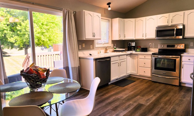 • Kitchen: Fully equipped kitchen with stainless steel appliances, new countertops, and ample cabinet space. You can use the sliding door to access the back deck where you can relax with your coffee or wine!