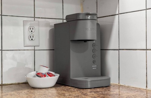 A fully equipped kitchen with modern appliances, including a dishwasher and coffee maker.