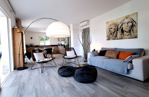The living space consists of a living room with modern decoration (WIFI, French TNT flat screen, Apple TV) and a fully equipped American kitchen where you will enjoy cooking (Oven + microwave, induction hob, dishwasher, washing machine, Nespresso coffee machine).