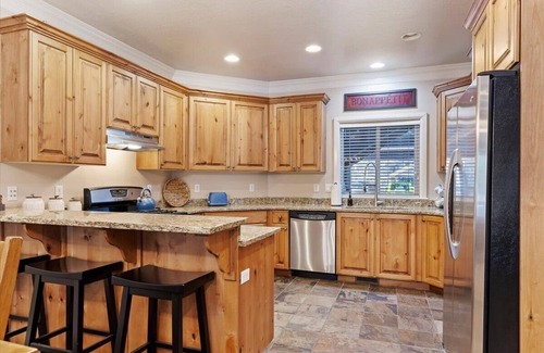 Ground-level condo. The main living room includes beautiful décor, a gas fireplace, flat screen TV, comfy couches, large picture windows, upper deck access, and a fully stocked kitchen. The kitchen has stainless steel appliances, cookware, dishes, spices, and many extras.