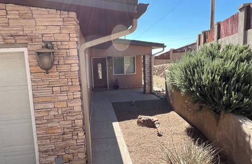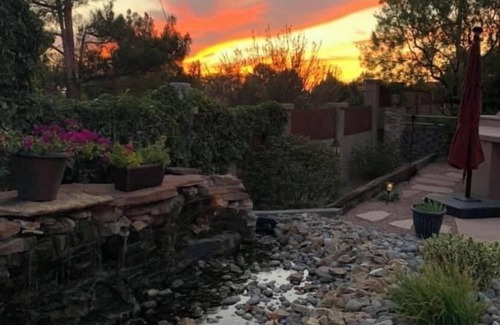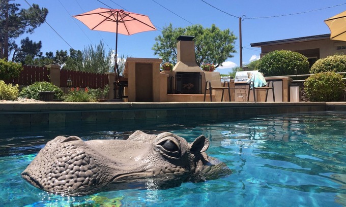 Charming 1200 sq ft guest house with 3 BR 2 BA nestled in the foothills of Albuquerque’s spectacular Sandia mountains. Refrigerated air and heat throughout. The backyard oasis boasts a warm, inviting heated pool and large hot tub. Enjoy the outdoor kitchen with grill, stove top, mini refrigerator and fireplace for dinner under the stars. Lounge and unwind to the peaceful sounds of the water fountain while stargazing or taking in a night swim. There is also a fun 9 hole putting green for getting a little golf in. This area has a variety of many birds and wildlife such as deer, fox, coyotes, raccoons, rabbits and squirrels that make themselves at home here and we also have a small turtle sanctuary.