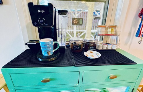 The kitchen is fully equipped with all appliances and cooking utensils to prepare your home-cooked feast. Gather around the kitchen bar or set up the card table or lift coffee table for indoor dining or puzzles. Child height fold open table, and two wooden chairs are in the twin bedroom.