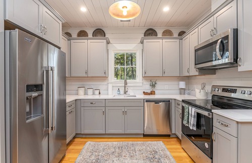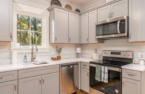 Enjoy this historically-styled accommodation with modern amenities and appliances! Each bedroom has an en-suite bathroom, with 2 bedrooms on one side and another bedroom/bathroom and kitchen + living room on the opposite. The kitchen is fully stocked with everything you need to enjoy your time on the marsh.