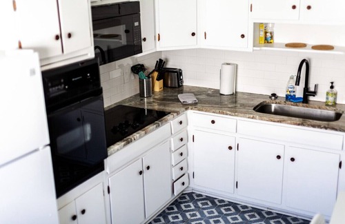 Off of the living room is a fully stocked kitchen with a full fridge, coffee maker (coffee provided), stove, microwave, toaster - all essentials for your prepping and cooking needs!