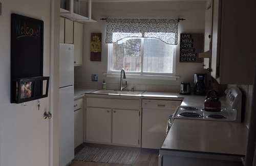 Walking in, you'll find a walk-in front closet, foyer, and a living room with a wood-burning fireplace (including a comfortable sectional and a leather recliner). The open floor plan on the main level also includes a dining area, kitchen (with coffee and tea), one bedroom with a queen bed, a three-quarter bathroom (with shower), and a washer & dryer. There is a 54" flat screen Smart TV in the living room, high speed Wi-fi, a Bose speaker, and a whole house evaporative cooler for the summer months.