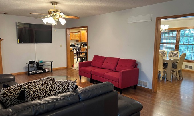 Enjoy a peaceful stay at this enchanting 3-bedroom, 2 full bath, 2 car garage single family rambler in Honesdale. Easy living designed for handicapped access. Nestled in the heart of the city, this tranquil retreat offers a superb escape for guests. Minutes to main street Honesdale, shopping, museums, train ride, and antique stores. The bedrooms are thoughtfully designed with a king bed, a queen bed, and twin beds, ensuring a comfortable night's sleep in all sizes. Full 8 seat dining room, gas fireplace living room, fully supplied kitchen, sunroom with exercise area, 2 car garage and open basement for your recreation. Mountain landscape with an abundance of wildlife. Near lakes and rivers with fishing and boating. Near Irving Cliff Gibbons Park, Veteran's Park and golfing. Local directory left in home. With amenities like central AC, WiFi, a washing machine & dryer, a hair dryer, curling iron, clothing iron and board and full cleaning tools, your every need is taken care of. Immerse yourself in the serene ambiance of this enchanting property, where you can relax and rejuvenate. It's easy to see why you'll be able to unwind at our place. Gas fireplace and gas grill included with stay. Deer, hummingbirds, groundhogs, and forest wildlife roaming the area. Because of this wildlife, children must be supervised. Full front porch with seating and plenty of space to walk, take pictures and reflect. You will be contacted with key information upon reservation. Contact me for any questions, I take long term rentals. Very clean- NO PETS/NO SMOKING.