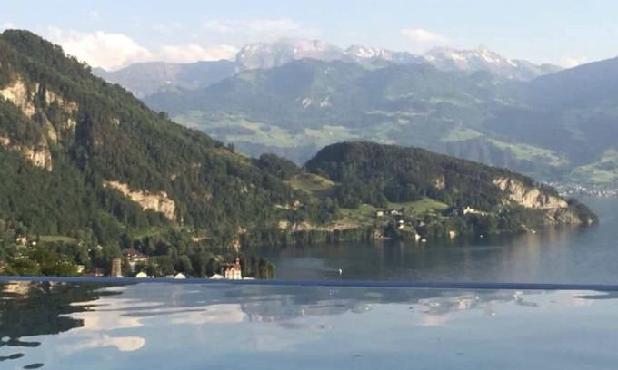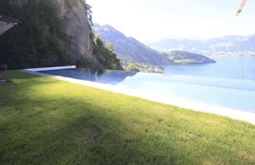 Only 20 meters from the entrance is access to a unique infinity pool with a unique view of Lake Lucerne. The pool belongs to the Villa of the host and is however on request at certain times for the guests available. The infinity pool is 18 m long and has integrated massage jets and a jacuzzi. Directly by the pool is a view vault, which can also be used by arrangement.