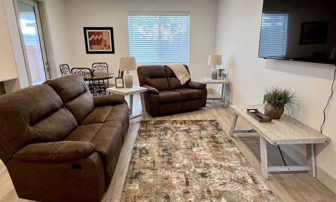 The 5 Smart TVs let you log into your favorite entertainment subscriptions (e.g Netflix, Hulu). Or enjoy old-school leisure chilling on the back patio with provided games, puzzles, playing cards, etc. Bedrooms feature 4 pillows per bed, fresh linens on comfortable mattresses, and spare blankets to stay extra toasty. Bathrooms include shampoo & conditioner, body wash, blow dryers, plush towels, and more. Park in a spacious 2-car private garage keeps your stuff secure and cool in the summer.