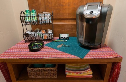 *Corazón Sagrado Suite: Queen Bed, Sleeps 2 Maximum; Adorned with sacred hearts decorated with silver Milagros or charms representing love, healing and gratitude, this suite has a special energy. For us, it evokes fond memories of our trips to Oaxaca, Mexico. Your private suite has its own entrance, opening onto a tranquil courtyard. Feel free to open your screened French doors and be soothed by the sounds of the fountain, wind chimes, and nature. Inside, you'll find a comfy queen bed with fresh quality linens, ensuite bathroom furnished with towels, soaps, shampoo/conditioner, hairdryer, mini-fridge, and beverage station stocked with coffee, tea, and plenty of filtered drinking water, screened French doors, and ceiling fan. Your suite has a Smart TV and WiFi (but no cable) so you can access your own accounts for Netflix, Amazon, Hulu, etc. If you are up for some fun and games, try your hand at cards, backgammon, or mancala that we’ve left for you to enjoy.