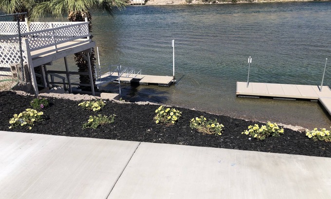 New 2022 riverfront home on the Colorado River across from the Casinos. Beautiful nighttime views of the Casino lights. Immaculate 3 bed, 2 bath, sleeps 8. 1500 sq foot. private boat dock, porch, patio, 3 car parking with covered boat parking perfect for boaters and snow birds. Full house wifi and blackout curtains. Minutes to water taxis, casinos and boat launch. Owner is offering huge discounts for over 25 day stay. Note: 3 exterior Owner video cameras are present-Back yard, Front door and Side yard door.