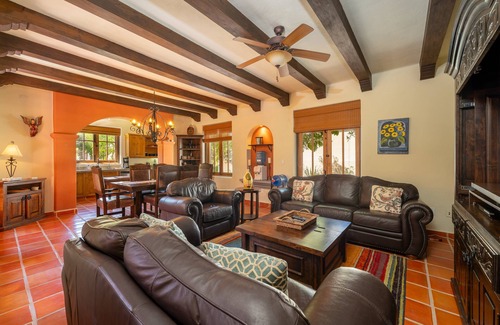 Past the main entrance to the casita, you will notice the beautiful flowering trees and a gurgling water fountain in a peaceful Mexican tiled and stone courtyard setting. To the left is the main room comprising the kitchen, dining and living rooms. This is your primary meeting place with a long communal dining table, oversized couches, ceiling fan, large streaming-enabled television, and a small workstation. The living room bureau offers books and games to enjoy. The kitchen has a full-sized refrigerator, dishwasher, stove, and full place setting for eight. Both bottled and filtered water are available.