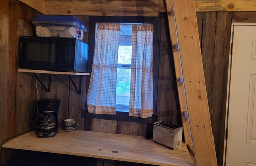 A separate sleeping cabin with a covered front porch (6' x 16') spanning the length of the cabin where you can cook on your propane grill or relax and listen to nature at your 2 person dinette. Your firepit and picnic/seating area are just off the steps.