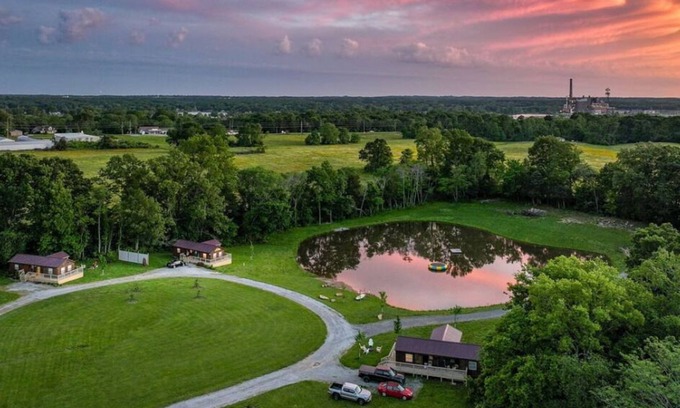 A total of 3 cabins and a 1.5-acre pond sit on 5 acres behind our home estate, separated by a privacy fence.