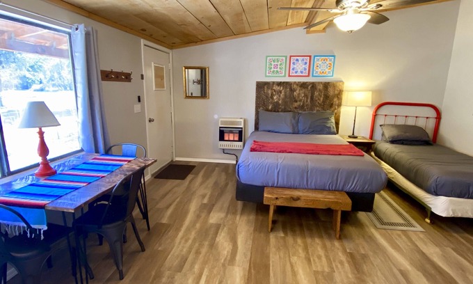 This unique newly remodeled one-room stucco casita is surrounded by the Gila Wilderness. This unit contains one room with one queen-size bed and one twin-size bed and has a full-size bathroom with a tub/shower combination. Your kitchen has a refrigerator, stove, microwave, and coffeepot. It comes equipped with dishes and pots and pans. Your cabin is tastefully furnished with artwork depicting the local area.