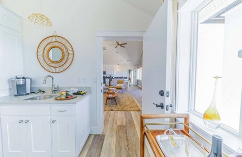 The SEASONG House, a mid-century modern gem, is designed for comfort and style with one bedroom, five beds, and 1.5 bathrooms. Featuring ocean-view decks and a fully stocked kitchen, its elegant decor creates a cozy yet luxurious retreat, perfect for drifting off to the sound of crashing waves.