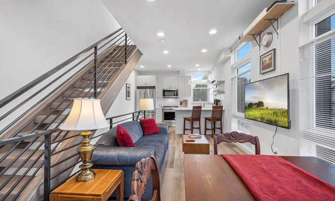The 2nd level has a fully-equipped kitchen, small dining, and a cozy living room with a comfortable couch and a 55" TV with streaming options provided!