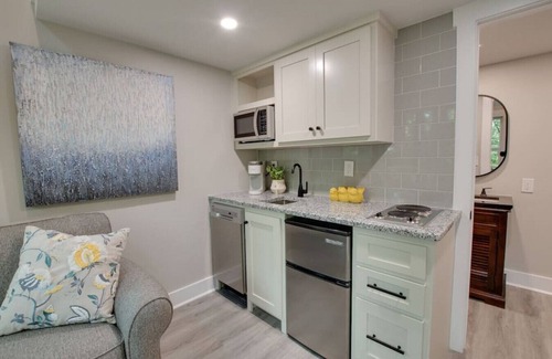 Come visit our Magnolia treehouse, one of six identical two story treehouses that are all dog friendly. Set on forty acres near beautiful Lake Guntersville, Alabama, our resort-style treehouse offers the perfect destination for a quick getaway or staycation. While residing at ReTreet you will have access to on-site activities such as Disc Golf, Hiking Paths, Corn Hole, Dog Park, and a Horseshoe Pit. Our vacation rentals come with a complimentary golf cart during your stay, as well as farm fresh eggs from our very own chicken coop. The treehouses feature a lofted bedroom furnished with a king sized bed, dressed with top of the line linens. Our kitchen is small yet mighty, equipped with many of the amenities you are accustomed to at home, including a dishwasher, mini fridge with a freezer, a Keurig and more. Some may call our bathrooms a show stopper, we only offer the best for our guests. With a glass walk in tiled shower, and a marble sink vanity, we stock the bathroom with towels and toiletries. The treehouses also feature a sofa pull out couch in the living room with an upgraded mattress, as well as two smart TVs for your relaxation pleasure.