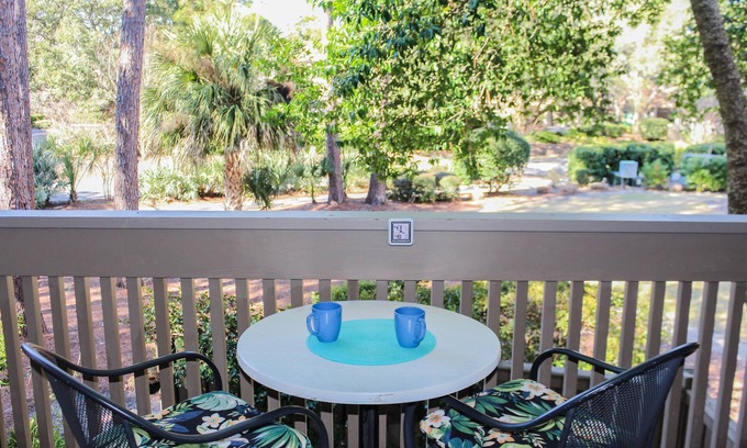 Best Location in Sea Pines in Bluff Villas, South Beach next to Marina and Salty Dog Cafe - Renovated including fully tiled bathrooms - luxurious new carpet in both bedrooms - new kitchen tile - 4 beach cruiser bikes included (saves over $100 in bike rental expense) to use on miles of Sea Pines well maintained wide paths and beautiful hard-packed beaches of Hilton Head - 7 min walk to Atlantic Ocean - short drive to Harbour Town heated pool (included in rate, no extra fee) - 3 minute walk to Sound (with large beach and daily DOLPHIN sightings) (bring your fishing pole) - 3 minute walk to Tennis (1 hr free daily+unlim walk-on time!) and new large world class PICKLEBALL facility across the street! - 2 minute walk to Salty Dog Cafe/Bar - balcony overlooks peaceful wooded area. 2nd floor beautiful fresh condo with only 7 stairs-steps to front door - King in Master w/50" mounted Smart TV - Queen and Twin in 2nd BR w/TV - Fam Room has new 55" Smart TV (all rooms Spectrum cable w/Sports package incl Golf Ch). Spacious living room and dining areas with comfortable furniture. Modern kitchen stocked with everything needed. Modern front load washer/dryer.