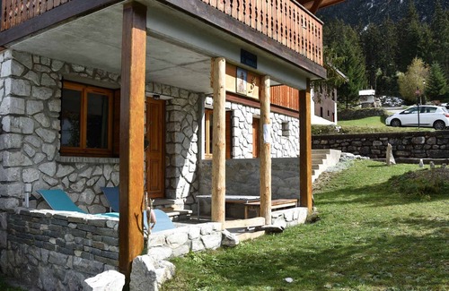 In a chalet, very quiet, 1km from the centre, cable car and ski slopes.