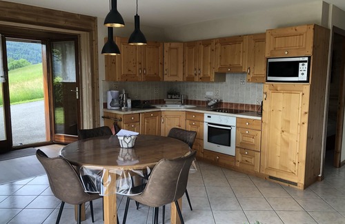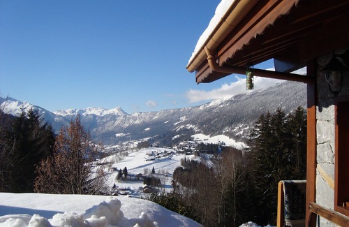 Superb apartment (tourism 3 stars), mountain atmosphere, on the ground floor of a chalet located on the heights of the village with stunning views over the Thônes valley and surrounding mountains in a green setting and CALM.
