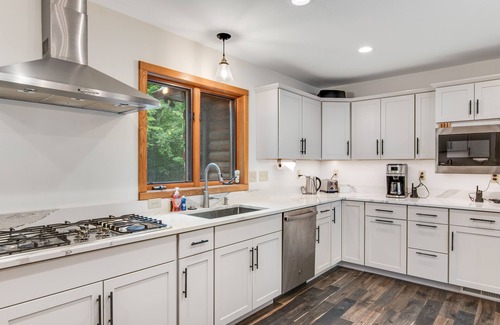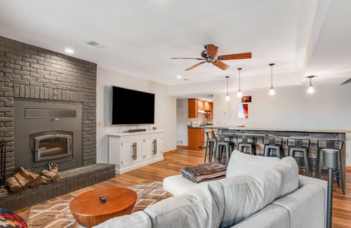 The main-floor kitchen is equipped for gourmet stylings with exquisite counters and deluxe stainless steel appliances, including two ovens, two sinks, a five-burner range, and a dishwasher. The first-floor kitchen has a stove/oven, fridge, and microwave for added convenience. Enjoy happy hour entertainment in the downstairs game room equipped with a pool table, speakers, an eight-seater bar, sofa, and smart TV, or unwind in the main-floor great room featuring a smart TV and large sectional. A cozy corner fireplace anchors both spaces for added ambiance and wintertime warmth. The formal dining table sets the stage for group gatherings with seating for 12. The in-home gym off the basement living area has a weight set and treadmill for home fitness needs.