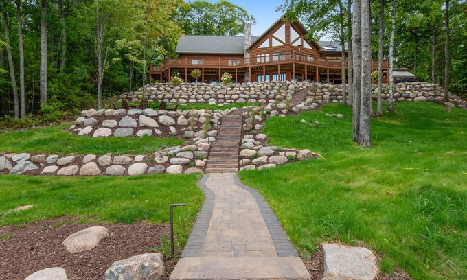 Vacation dreams come true at this three-story log lakefront chalet on Statenaker Lake. Boasting a private hot tub, a game room, and an in-home gym, this amazing retreat is designed for group comfort and entertainment paired with waterfront views and lake access. Adventure awaits no matter the season - during summer, explore one of the marked trails throughout the property or hit the lake with the provided water toys, including a swim raft, rowboat, four kayaks, and two paddleboards! Come wintertime, enjoy snowmobiling, snowshoeing, and cross-country skiing. Make the most of blue sky days with backyard cookouts on the expansive deck using one of the gas grills, then gather around the firepit when the stars come out.