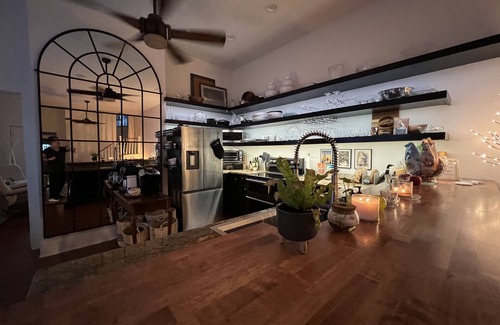 The kitchen is outfitted by Williams Sonoma, made-in, and Caraway. The sheets are linen; comforters and pillows feathery and fluffy; towels and robes are made by Turkish Towel company.