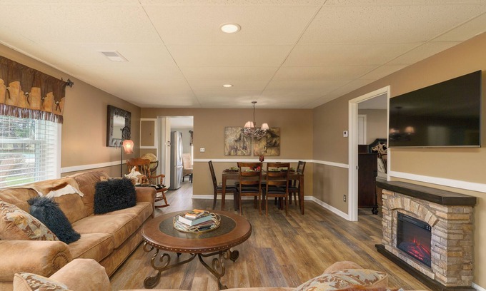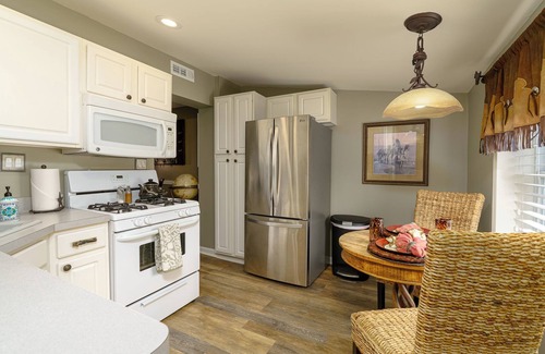 The Quaint Interior of this One Floor Single Story Western Decor Themed Property is Outfitted with Well-Coordinated Fixtures and Furnishings. As You Enter the Guesthouse from the Back Elevation of the Building you Walk into the Mudroom Laundry Area. The Mudroom/Laundry has a State-of-the-Art Front Load Washer and Dryer. There is also a laundry Sink Basin in this Area. A Small Transition Hallway Connects Guests to a Full Bath and Well Outfitted Kitchen. From the Kitchen Guests Enter into a Large Dining Room/Living Room Area. This Space is Ideal for Entertaining/Casual Meal Playing Board Games or Relaxing Watching a Movie or Television Series. Adjacent to the Dining Area is the Entrance to the Master Bedroom the Western Style Bedding on the Comfy Queen Bed and Surrounding Furnishings are Warm and Inviting. The Master Bedroom has a Private Entrance into the Bathroom which is a Full Bath also Done in a Chic Western Theme. The Second Bedroom Houses Two (2) Twin Beds with New Hotel Style Quality Mattresses. This Bedroom is Well Coordinated in a Western Theme Much in Line with the Balance of the Interior.