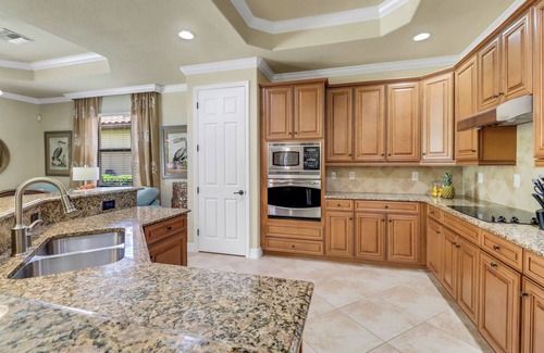 Welcome to this stunning Victoria Model home in Treviso Bay! This fully furnished vacation rental boasts an open floor concept with two charming bedrooms, two luxurious ensuite bathrooms, and an office area with a fully equipped workstation and sofa bed. The kitchen, stocked with all the essentials, overlooks stunning water views to inspire any chef.