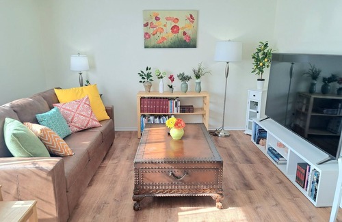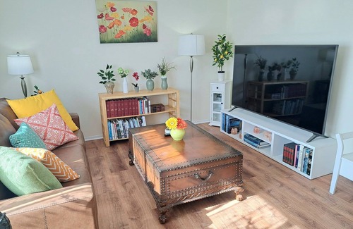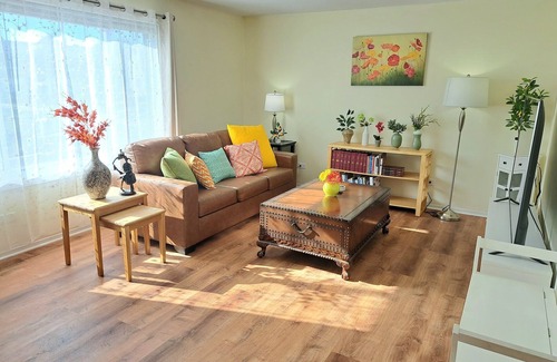 Bright and peaceful 2nd floor unit. Master bedroom comes with a queen size bed. Second bedroom a full size bed. Living room is furnished with a new leather queen sleeper couch. Both bedroom windows are furnished with blackout curtains and blinds. Living room has a 75 inch LG smart TV. Electric was updated with all new outlets and switches throughout the apartment. Bathroom was recently remodeled. Kitchen comes with a brand new range/oven. Unit has newer luxury vinyl plank flooring throughout. Kitchen is fully stocked with everything you need to cook. We provide a toaster, blender, 12-cup coffee maker, K-cup Keurig coffee maker, electric kettle, rice cooker, crock-pot, dishes, bowls, pots and pans and much more! Coin washer and dryer are available in the building.