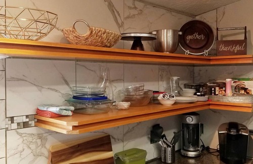 Kitchen remodel recently remodeled and all new cabinets installed with marble like wall and in style open shelving. Includes a huge custom teal colored concrete topped island (super sanitary) with bar stool seating, massive pantry plus stainless steel on sink countertops.