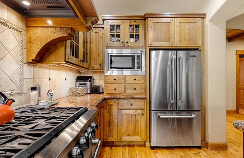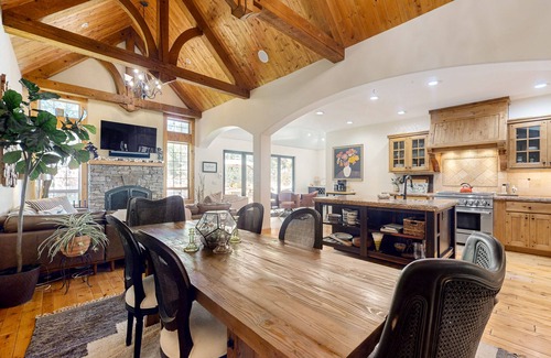 The Great Room features cathedral ceilings with timber-pegged beams, a wood-burning masonry fireplace with a gas starter, and a smart TV. The home office provides a peaceful spot to plan vacation adventures. Prepare delicious meals in the gourmet kitchen, outfitted with stainless steel appliances and granite countertops – or sit in the covered patio while your grill master tends the fire. Have meals at the dining table, kitchen breakfast nook, covered patio, circular iron outdoor table, under the Juniper pine, or at the umbrella-shaded table at the very back of the property, with the murmur of the river down below.