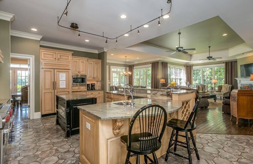 The adjoining library off of the master suite with a quaint sitting area for TV time, reading or cozying up by the fire. There is a large billiard room with a gas fireplace and elegant pool table for your enjoyment. The home features an epicurean kitchen with all possible amenities to make your stay enjoyable. From the warming drawer to the commercial grade stove with built-in Sub-Zero refrigerator, dishwasher and all needed appliances and granite tops, cooking in this kitchen will be a breeze. Family and friends are never far away in the large adjoining family (keeping) room with a panoramic view of the lake, gas logs fireplace, 65 inch LCD Smart TV over looked by an 8-person table in our breakfast room. The home would not be complete without the spacious formal Dining Room and the elegant 2-story foyer adjoining with marble floors.
