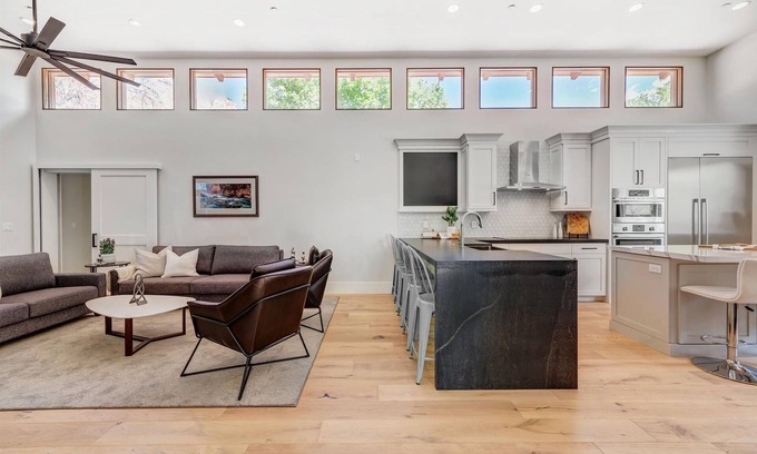 Step inside to discover a meticulously remodeled interior featuring contemporary design elements. The house boasts two full kitchens equipped with stainless Bosch appliances and dazzling quartz countertops, making catering for your wedding a breeze. Gather your guests in the two spacious dining rooms or one of the inviting living areas complete with Smart TVs. Additionally, enjoy the luxury of four full bathrooms, each outfitted with walk-in tile showers and European glass doors. Outside, the private patios offer breathtaking views of Zion's majestic red cliffs, perfect for capturing stunning wedding photos as the sun sets in a blaze of color.