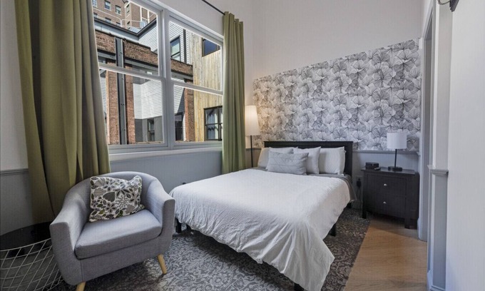 Staying in Mercantile Mini 302, uniquely provides a modern feel to Morris Ave. that is listed on the National Register of Historic Places. The rooftop patio gives a beautiful insight to growing city as you overlook the quiet railroad tracks and peaceful city lights at night. Step into a bright, open-concept living space with sleek finishes, high ceilings, and floor-to-ceiling windows that let in plenty of natural light.