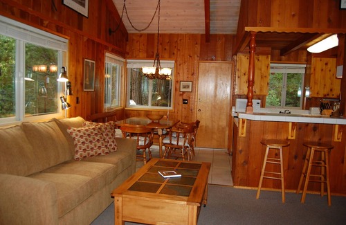 Dunning's Retreat is a private and secluded, 2 bedroom, 2 bathroom home that sleeps up to six guests. The fully equipped kitchen has all cooking and dining essentials, including a dishwasher. The living room has a fireplace (wood provided in season), satellite TV, and WiFi. There is also a laundry room with a washer and dryer and an in-room A/C. Outside on the deck, you will find several sitting areas with chairs and lounges, a picnic table & benches, and a gas BBQ No Pets Allowed. "EV Charging Station available within five miles of the cabin"