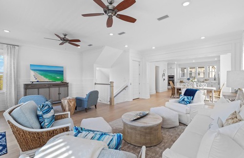 Escape to coastal luxury in this new 30A vacation rental, The Beach House, located in the sought-after gated community of Bluewater Landing. Nestled on the south side of 30A, this stunning home is just a short walk from pristine beach access, ensuring easy access to the sugar-white sands and emerald waters. With nearby dining, shopping, entertainment options, and the home’s thoughtful amenities, this is the perfect retreat for families or groups seeking a luxurious and relaxing getaway.