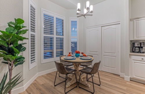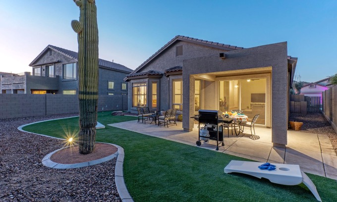The home's backyard amenities include a covered porch with dining furniture and a propane grill. Arizona's 300+ sunny days make it possible to dine al fresco style for many of your meals. A corn hole game and private putting green are exciting outdoor activities that guests of all ages will enjoy.