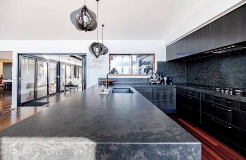 The entry and double garage flow onto the mid level of the house. Enjoy cosy winter evenings watching the large Apple TV with Netflix (own account login). The living area flows seamlessly through to the pool area and spacious sundeck. The house is an entertainer's delight with large bi-fold doors opening up the entire indoor space to the outdoor deck and those gorgeous views. Weber family BBQ and comfortable outdoor setting and daybed complete the mid-level space. There are ample places to relax in the sun with a book and capture the sea breezes. There is also air conditioning on this level.