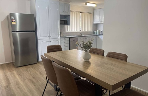 This four-bedroom, three-bathroom home in Mount Austin is just a 7-minute drive to Wagga Wagga Central. The master bedroom features an ensuite, and most rooms have built-in wardrobes. Enjoy a spacious backyard, large shed, and undercover patio. A generous carport accommodates up to four vehicles—perfect for families or entertainers. This home is provided with essentials, dryer, washing machine, dishwasher, sheets, bathrooms amenities and free wifi.