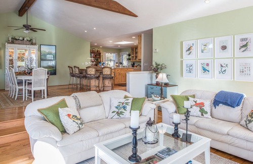 Prints of birds and botanicals and a crisp lime-green and white color scheme bring nature indoors in this immaculate home that features a spacious great room, high beamed ceilings and hardwood floors.