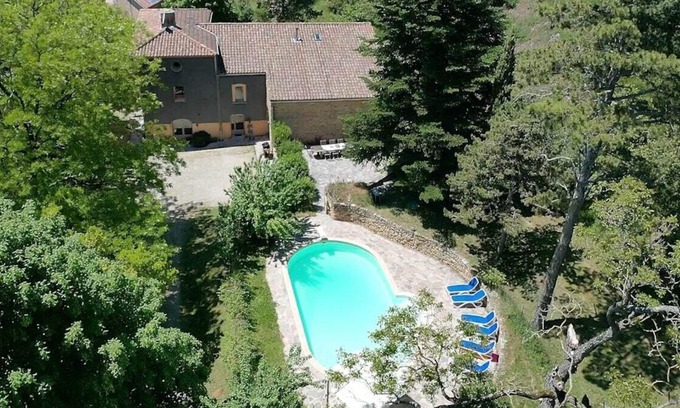 Rustic and cheerful villa with heatable pool in Vélieux, Languedoc Roussillon, France for 6 persons. The house is situated in a hilly, wooded and residential area.