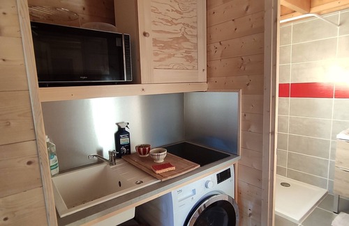 The kitchenette is fully equipped and overlooks the living room with large bay windows. From the sofa the view of the mountains is superb. A pretty wooden staircase climbs into the attic room. With its functional and stylish bathroom, its 2 independent bedrooms, everything is harmoniously arranged to take full advantage of the 35 m2. A real comfortable and cozy little nest for unforgettable moments with family or friends.