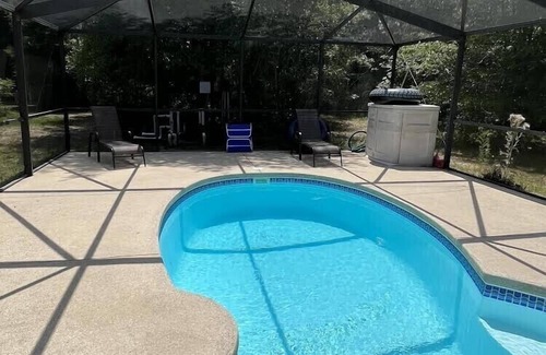 JUST 3 steps from the Back porch you have your Beautiful TOTALLY PRIVATE, in-ground screened outdoor PRIVATE pool, with your own very comfortable loungers! (open April- Oct) . Open for sunning 12 months
