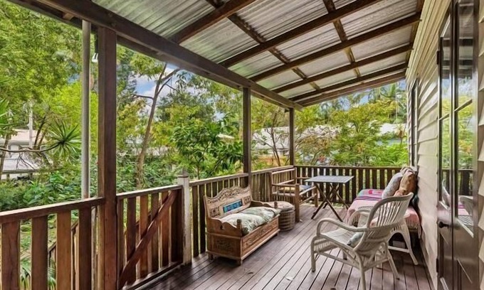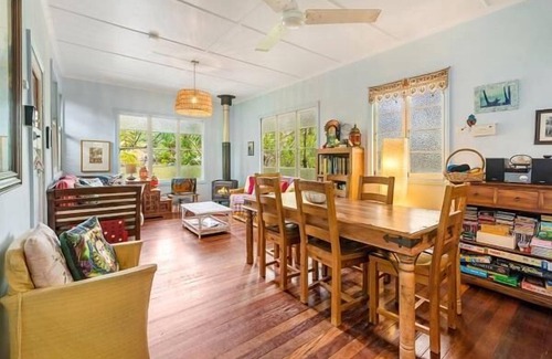 Enjoy your stay at this beautiful, soulful, bohemian style Queenslander Home, offering lovely private spaces with covered verandas and large bedrooms. This relaxed cottage sleeps 4 guests and features 2 bedrooms, one Queen bed and one Double bed, one undercover car space, an open plan fully equipped kitchen adjacent to an inviting living and dining area with cosy fireplace.
