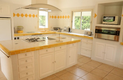 A very large, bright and functional kitchen: oven, microwave, fridge, dishwasher, hob... A table and 6 chairs complete the furnishings.