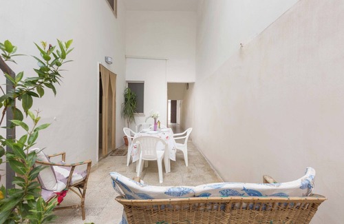 L`ingresso all`appartamento Dimora Emanuele è in un corridoio coperto da cui si entra in un cortile interno di pertinenza esclusiva, arredato con tavolo e sedie dove poter pranzare e cenare all`aperto, e con divanetto da esterni per il relax.