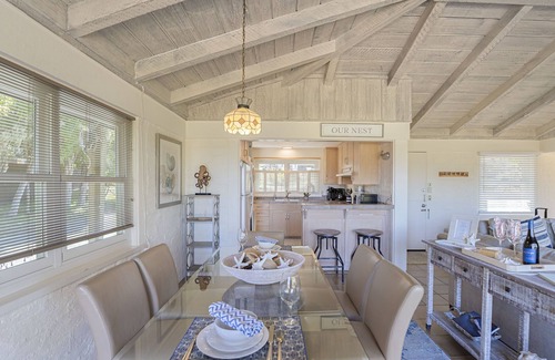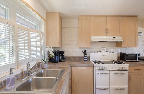 Inside, a glass dining table near the window features seating for six; there are also two more seats at the adjacent kitchen counter. The fully equipped kitchen (no dishwasher) offers tile countertops, a double sink, a Keurig machine, and a vintage O’Keefe & Merritt four-burner gas stove with a center griddle. Access to the kitchen is available from a side door that opens onto the parking area.